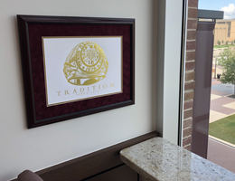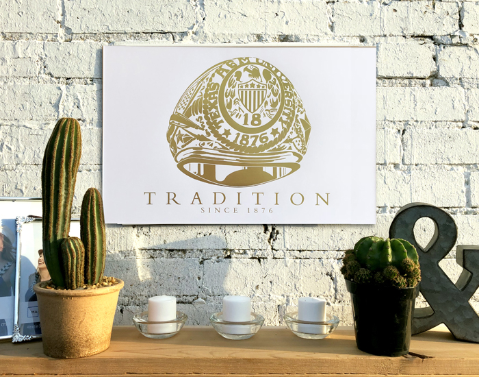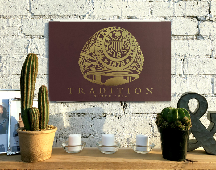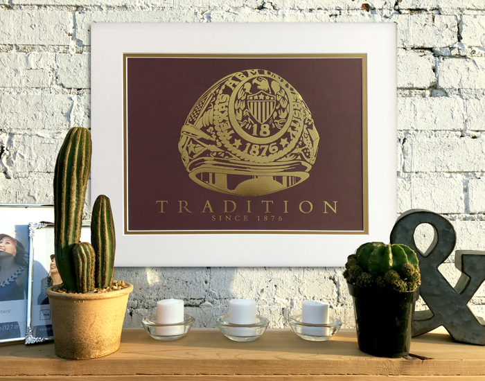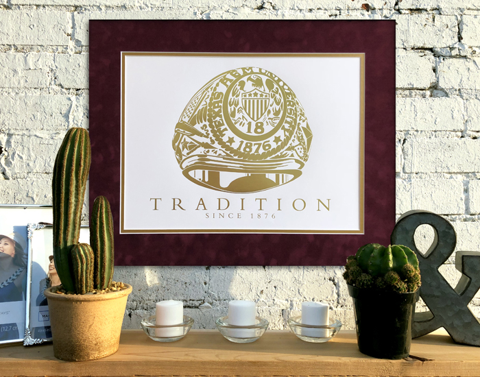 The Texas A&M Class Ring is a symbol of a greater network Aggies have spent countless hours building all across the nation. The ring is an iconic symbol of team unity. It was paramount this print was designed in a style as timeless as the Aggie Network. As a symbol of school legacy, this design was originally hand drawn in the style of traditional photo realism. Once the drawing was complete, the lines were then refined digitally until the final image had a clean and professional appearance to emulate the quality of candidate the ring was intended to represent. For the finally, gold foil printing was chosen to provide the piece with a sharp and classy finish.