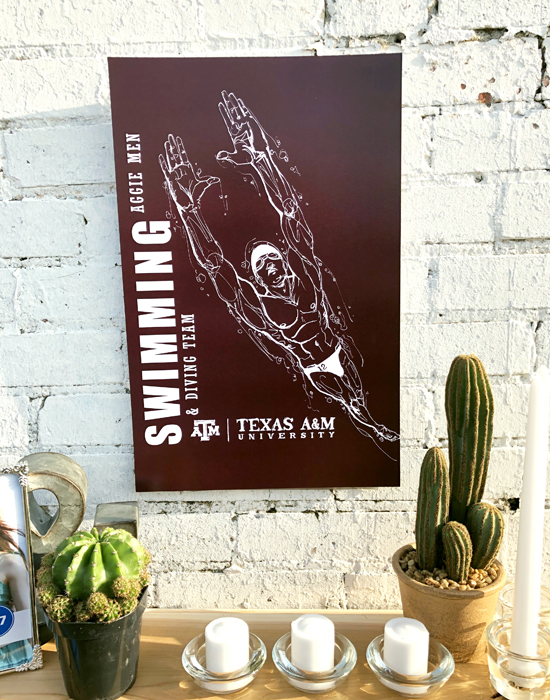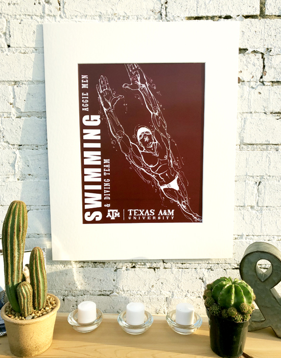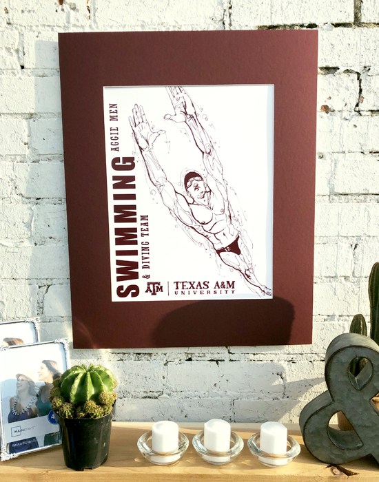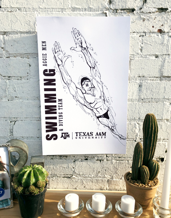Athletics is the celebration of the movement of people. The featured drawing is one of several finely inked collectables in a series of the 18 varsity sports at Texas A&M and the celebration of their unique individual movements. The style stems from the art of 'classic figure drawing' and 'continuous contour'. Using a cocktail of good ol' fightin' Texas Aggie Team Spirit and an elegant use of negative spacing and portraiture, the result was intended to be truly impressionable.